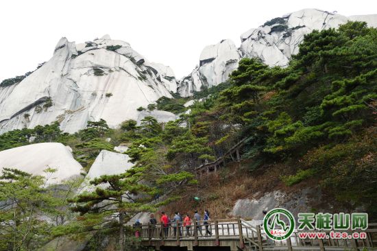 同事的關(guān)切,還是把我從尋靜中拽入歡鬧,思緒隨著涌動前行的人群自然改變。導(dǎo)游口中的天柱山如天際的變幻莫測的云,一會絢麗多姿,妖冶深沉。導(dǎo)游說,天柱山奇峰凌云,巍峨崢嶸,斷崖絕壁,雄渾厚重;它怪石林立,狀人狀物,奇洞異景,妙趣橫生。最高峰——天柱峰如擎天巨柱,雄偉壯麗,猶如石筍,拔地入云,頂天立地,它海拔1489.8米,突兀佇立在群山之巔,整座山峰就是一塊灰白色巨石,松樹稀疏地生長于巨石間。此時,我想起余秋雨所說的,天蛙峰因峰頂有巨石很像一雙青蛙而得名。與天蛙峰并列有降丹峰和天書峰,一峰峰登上去,遠(yuǎn)看四周,云翻峰涌,確實是大千氣象?!疤熘狈?#xff0c;如“天柱”,斷崖千仞,云繚霧繞。美,如莊子所言:天地大美。所有的文字都是累贅,所有的語言都將拋棄,所有的色彩都要傾倒。我只能仰視,遙對著“孤立擎霄”、“中天一柱”和“頂天立地”12個石刻大字驚嘆,流連。憑欄遠(yuǎn)眺,山巒間的云霧繚繞,松翠鳥鳴,那種特有磅礴彰顯不僅是醉人的嫵媚與婀娜,還有天地萬物的潔凈和蒼茫,在纖塵不染的大自然面前,我豁然找回久違的本真,一種天地包容般地震撼撞擊著心靈,熱淚毫無掩飾地奪眶而出。